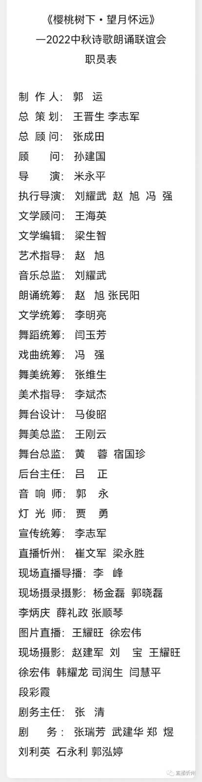 《直播忻州米永平、李志軍訊)9月8日晚,一場(chǎng)別開生面的“櫻桃樹下·望月懷遠(yuǎn)”中秋詩(shī)歌朗誦聯(lián)誼會(huì),在“櫻桃樹下自在農(nóng)莊”草坪廣場(chǎng)隆重舉行,這是忻州市首家“企業(yè)搭臺(tái),自媒體唱戲“舉辦的活動(dòng)。忻州市政協(xié)副主席王海英親自撰寫的《櫻桃樹下·望月懷遠(yuǎn)》拉開了本次晚會(huì)的序幕